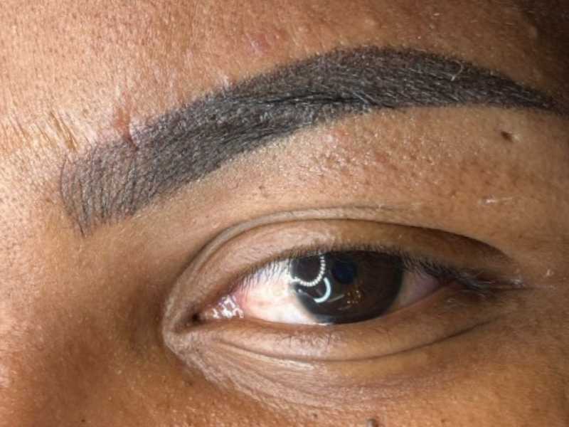 tem cicatrizes nas sobrancelhas, reparando totalmente